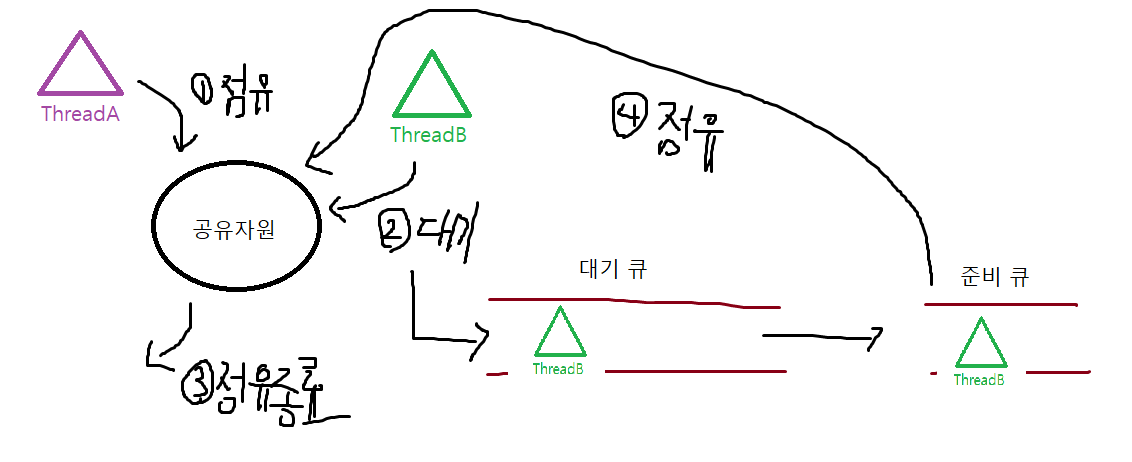 대기 큐에 있는 스레드는 준비 큐로 이동하고 공유자원을 점유하게 된다.