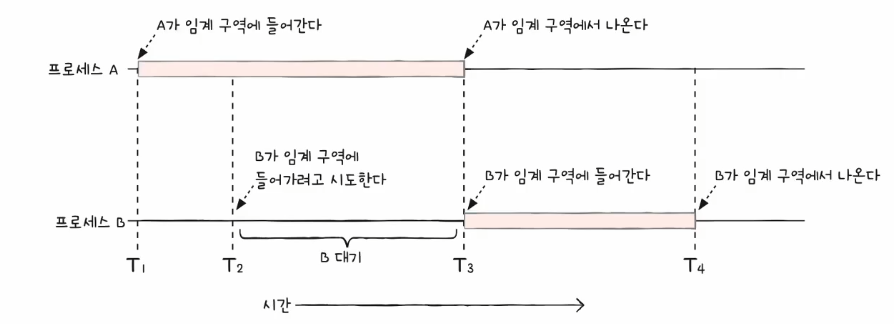 두 개 이상의 스레드가 임계 구역에 진입하고자 하면 둘 중 하나는 대기해야 됨
