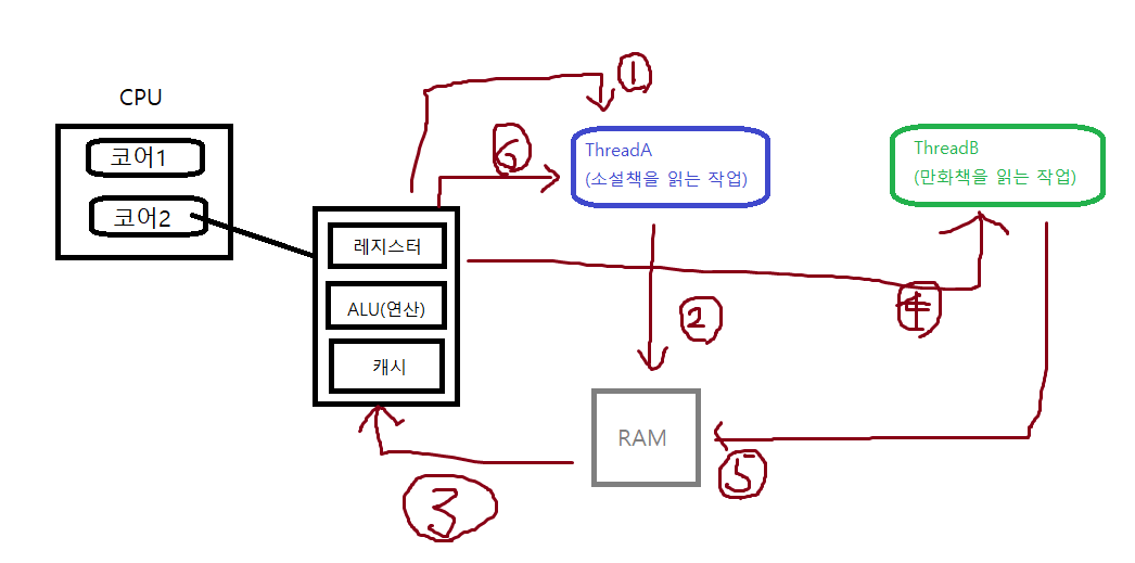 이렇게 기존에 실행중인 프로세스를 중단하고 다른 프로세스가 실행되는 과정이 많이 발생하면 소설책만 계속 읽는 것보다 작업속도가 느려질 수 있음