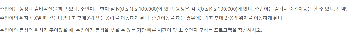 그리고 시작 위치가 주어지는 범위가 0~100,000 사이인 것이지 이동 중에는 100,000을 넘길 수 있다는 사실을 인지해야 된다. 그래서 배열의 범위를 200,000으로 세팅하면 문제없이 풀 수 있다.