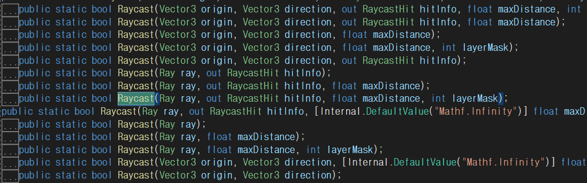 Raycast 메소드의 return 타입은 bool 인데, overload 방식에 따라서 hit 되는 방식이 달라진다.