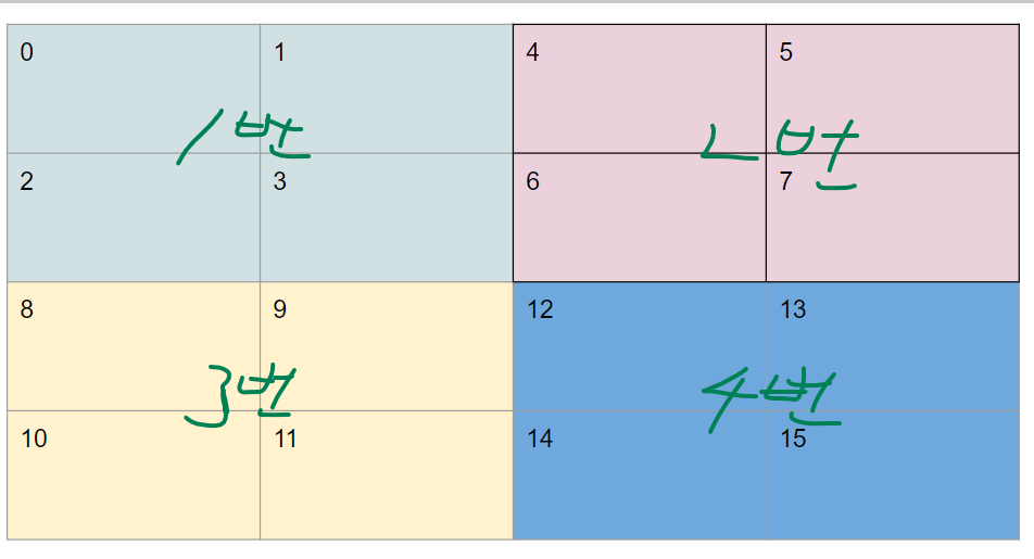 4번 사각형 : 4번 사각형이 위치한 x좌표(행)과 y좌표(열) 둘 다 half와 같거나 큰 경우