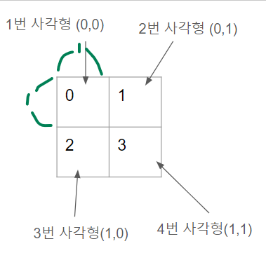 1번 사각형 : 1번 사각형이 위치한 x좌표(행)과 y좌표(열) 둘 다 half(배열의 한 변의 길이의 반)보다 작은 경우