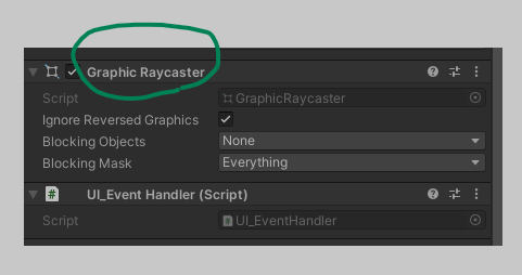 다음은 Image UI를 마우스로 클릭했을 때 클릭 이벤트가 작동하도록 구현하려면 "Graphic RayCaster" 추가되어 있어야지 IPointer 핸들러 이벤트가 작동할 수 있다.