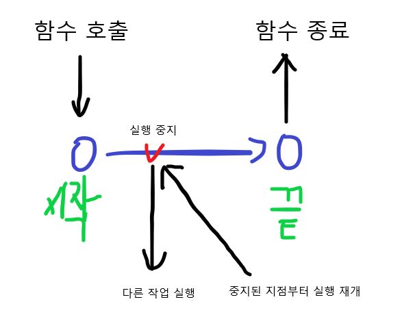 코루틴은 함수 진입 후 반환문(return)이 없거나 코드가 끝까지 실행되지 않더라도 임의 지점에서 동작을 중단하고 이후 해당 지점에서부터 실행을 재개하는 방식으로 이루어진다.