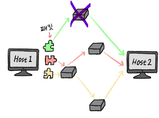이렇게 패킷 단위로 전송하면, 각 패킷은 다양한 경로를 사용하여 이동하고 중간에 회선이 끊켜도 다른 패킷들은 안정적으로 전송이 된다.