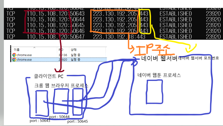 클라이언트 단에서 크롬, 엣지 .. 등 웹 브라우저 프로그램을 실행해서 네이버 홈페이지를 들어갔다고 했을 때 네이버라는 웹서버가 사용중인 포트번호는 보통 HTTP/HTTPS인 80번과 443번을 사용한다.