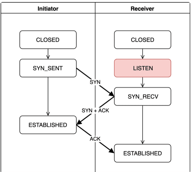 1. 요청자(클라이언트)가 연결 요청을 보내기 전까지는 수신자(서버)는 Listen 상태로 대기