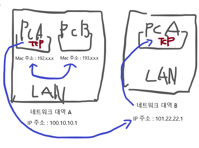 다른 네트워크 대역에 있는 노드와 통신하기 위해서는 3계층이 필요함