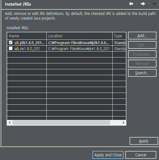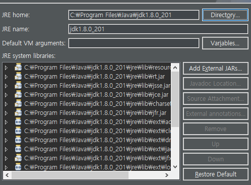 6.JRE home 우측의 Directory 버튼 클릭 후 javaFX가 설치된 jdk 폴더 선택