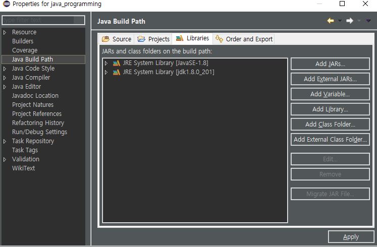 1. 이클립스 메뉴바 프로젝트 클릭 후 properties를 선택하면 아래의 창이 나온다. 라이브러리 추가 버튼을 누르자