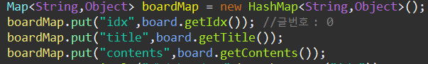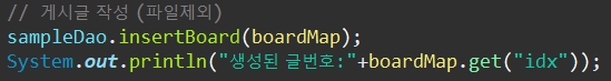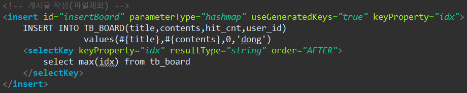 위에서는 <selectKey>태그를 사용해 게시글이 작성이 된 후 가장 큰 글 번호 값을 받아서 Hashmap 타입으로 파라미터를 설정해 주었던 초기의 idx(글 번호-0) 값을 작성된 글번호 값으로 세팅해줄 수 있음