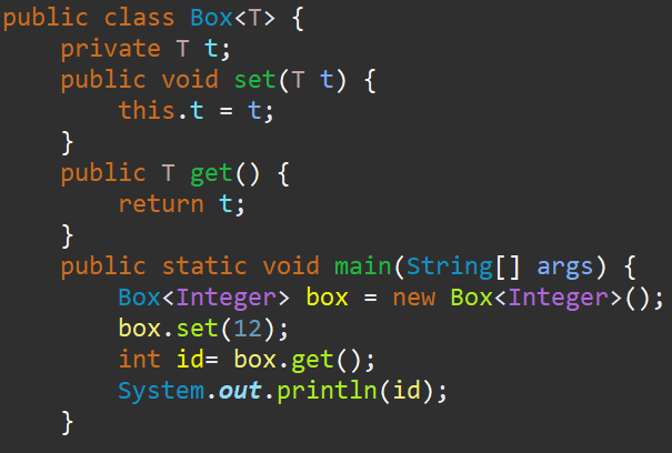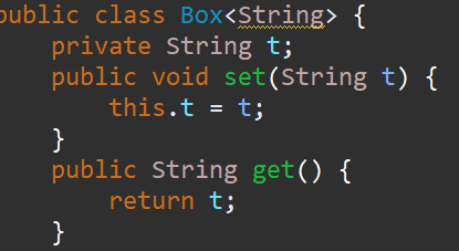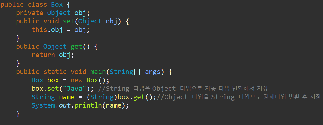 타입 파라미터 T를 사용해서 Object Type을 모두 T로 대체한 후 Box 클래스로 객체를 생성할 때 구체적인 타입으로 변경된다. 아래 코드는 타입 파라미터(T)를 = String Type으로 대체하였는데 set, get메소드를 사용할 때 타입 변환이 일어나지 않는 걸 알 수 있다.