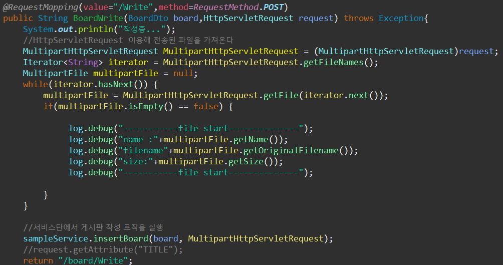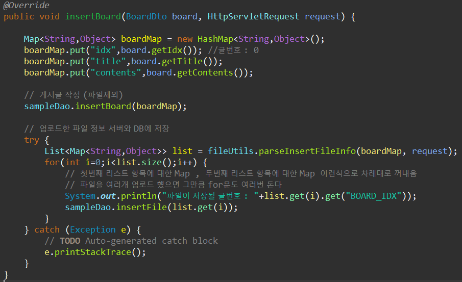 - fileUtils.parseInsertFileInfo(boardMap, request) 부분은 클라이언트가 업로드한 파일을 서버의 파일 저장소에 저장하는 부분이라 생각하면 됨