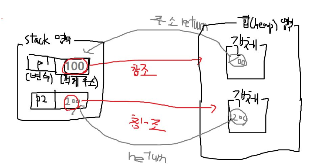 new 연산자로 생성된 객체는 메모리 힙(heap) 영역에 객체를 생성시키고 객체의 주소를 리턴함 이 주소를 참조 타입인 클래스 변수(p1, p2)에 저장해두면 변수(p1, p2)를 통해 객체를 사용할 수 있음 위 그림에서 같은 Person이라는 Class로부터 객체가 생성이 되었지만 p1, p2 참조하는 Person객체는 완전히 독립된 서로 다른 객체이다