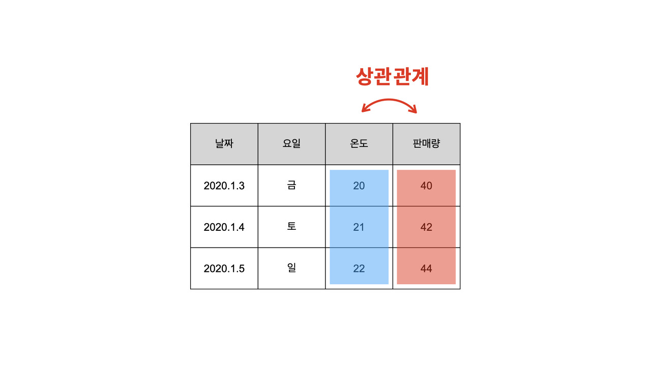 위 표에서 온도가 변함에 따라 판매랑도 변하기 때문에 두 개의 특성은 서로 관련이 있고 상관관계에 있다고 함