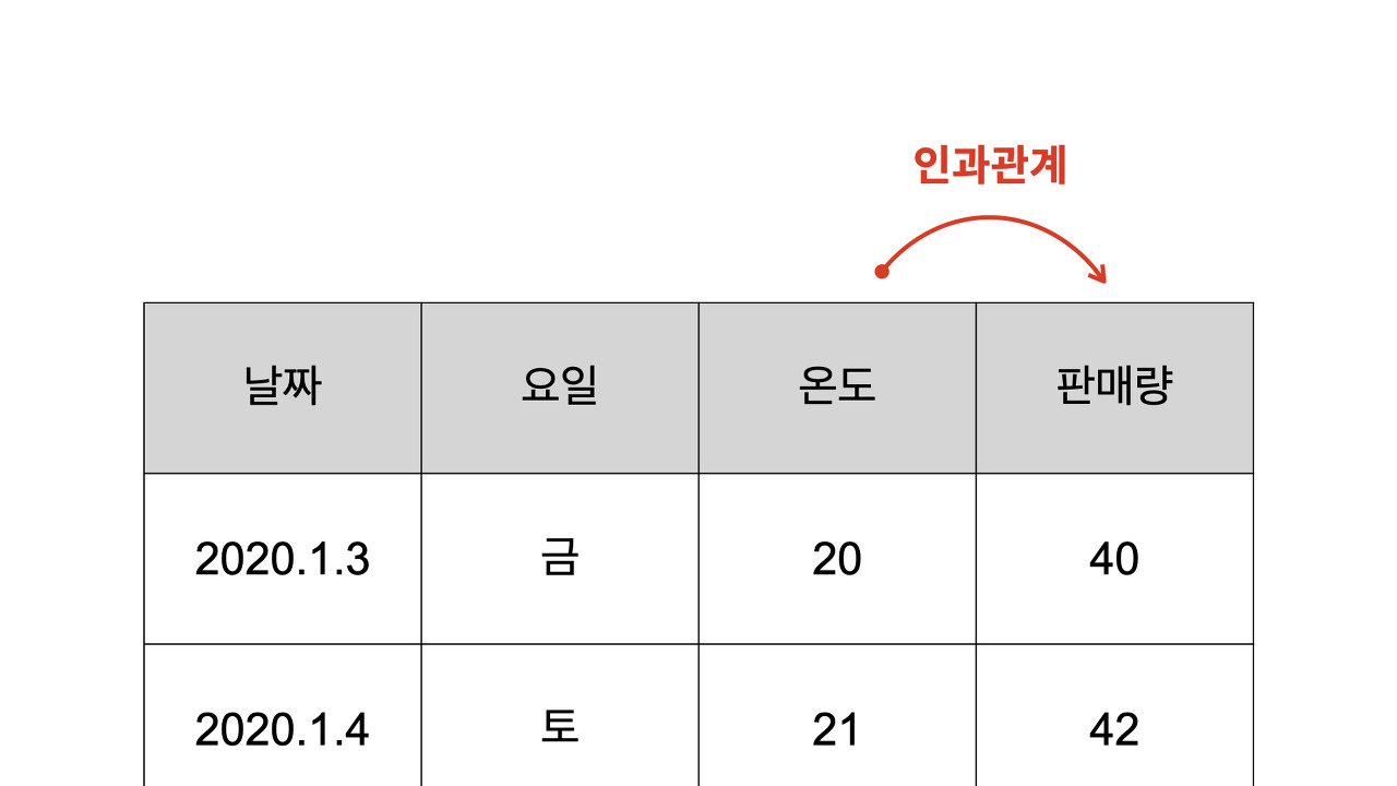 -> 종합하자면 온도는 원인이고 판매량은 온도에 대한 결과라는 것을 알 수 있음 (인과관계)